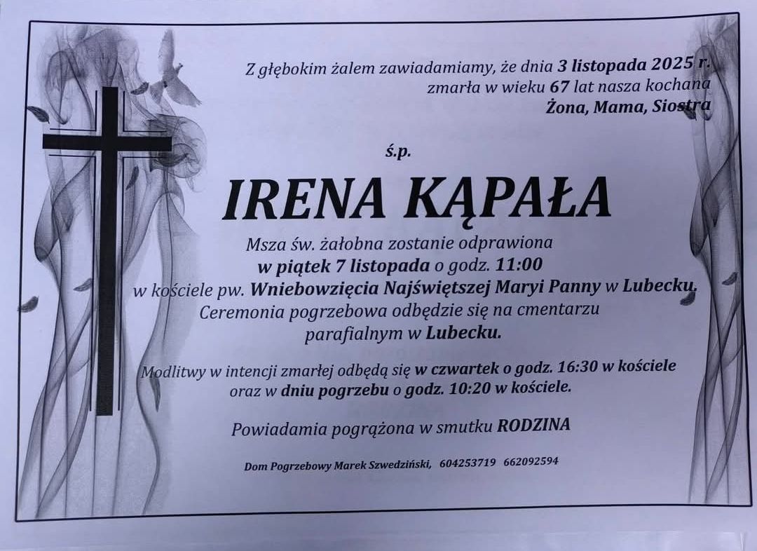 Msza święta żałobna odprawiona zostanie w piątek, 7 listopada o godz. 11:00 w kościele pw. Wniebowzięcia Najświętszej Maryi Panny w Lubecku.
